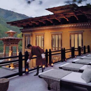 Set on a beautiful 10 acre property, Zhiwa Ling offers many guest amenities?spa, fitness center, sauna, steam room, traditional Bhutanese outdoor hot-stone bath, tea house, meditation house, greenhouse and even a temple, honoring the spiritual heritage of this ancient Buddhist kingdom made with 450-year-old timbers from the famous Gangtey Monastery. The two hotel restaurants specialize in contemporary international cuisine and classic Bhutanese dishes. Each of the 45 suites affords splendid views.