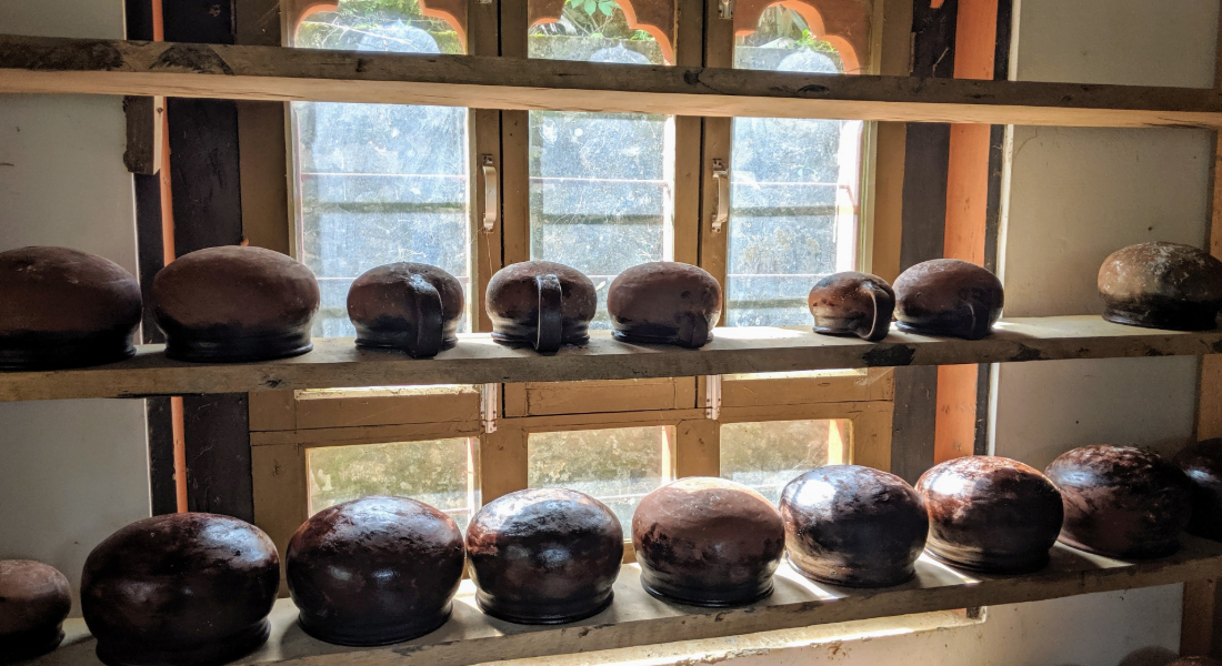 This morning, we hike from the homestay to the Sangwa Lo Dru meditation cave, high above Khoma Village. This is a popular meditation spot, and the hospitable caretaker shares with us the history behind the meditation cave, as well as details about the holy relics of this sacred site.