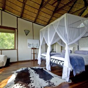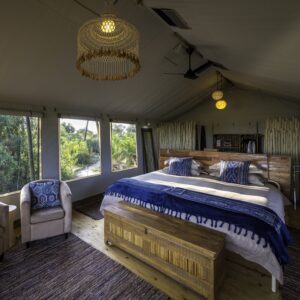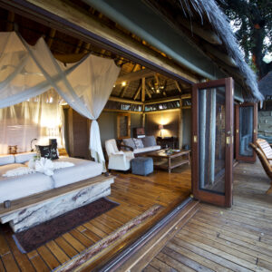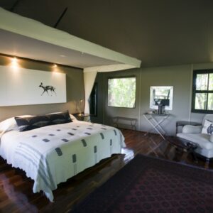 Two separate seven-roomed luxury camps, each with its own raised dining, lounge and bar area tucked beneath a canopy of trees, command magnificent views across the floodplains. Large, luxurious rooms featuring contemporary African design are raised on wooden decks and each have a bedroom, lounge, en suite bathroom with indoor and outdoor shower, private plunge pool and sala. A stargazing deck extends into the floodplain, surrounding a convivial campfire.
