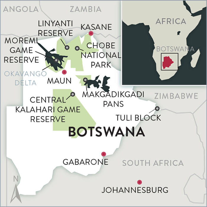 Day 1: Arrive Maun; bush flight to safari camp in Moremi Game Reserve; evening game driveDays 2-3: Game drives and guided bush walks in Moremi Game ReserveDay 4: Morning game drive; bush flight to safari camp on a private reserve in Okavango Delta; evening game driveDay 5: Mokoro and other boat and Land Rover-based game viewing on a private reserve in Okavango DeltaDay 6: Morning game viewing; bush flight to safari camp in Linyanti Region bordering Chobe National Park; evening game driveDays 7-8: Game drives and guided bush walks in Linyanti RegionDay 9: Bush flight to Maun or Kasane for international departure