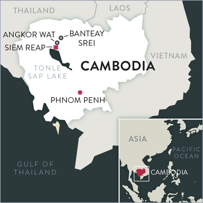 The temples of Angkor, which cover an area the size of New York’s five boroughs, were built from the 9th to the 12th centuries by the Khmer empire that controlled not only Cambodia but also large parts of what are now Laos, Thailand, and Vietnam.