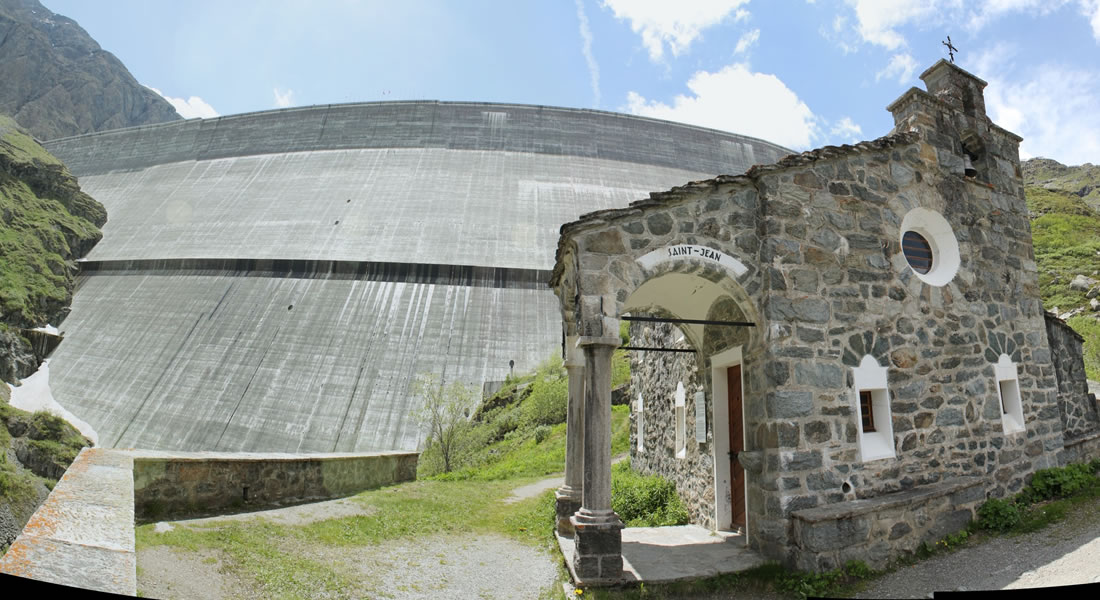 This morning after breakfast we depart on foot from our hotel, ascending a trail along the side of the dam for about a ½ hour to reach the top. Along the way we stop to rest at a small chapel dating from the 1930s, built by the workers who constructed the original Barrage du Dixence, now submerged beneath the waters of the much grander dam that stands today. As we clear the top of the dam, our hike levels out and meanders through hand-hewn tunnels and along a flat, wide track that follows the western shore of Lac des Dix (7,887').