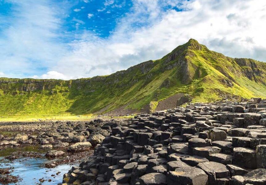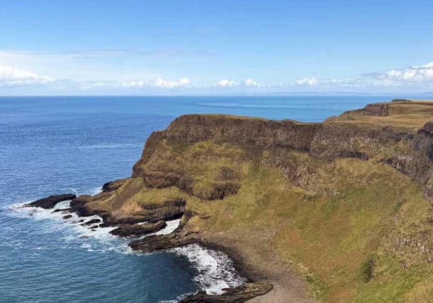 Spend the day traversing one of the most iconic coastlines in the world, following a high-level trail that hugs the emerald cliffs of the North Atlantic. This expansive trek offers bird’s-eye views of secluded bays and turquoise waters before descending into a legendary landscape of 40,000 interlocking basalt columns. You will have ample time to explore these unique geometric formations, shaped by ancient volcanic activity and steeped in local folklore, before continuing along the coastal path toward the ruins of a medieval castle perched precariously on the cliff’s edge.