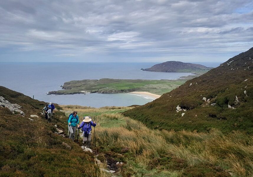 Cross the border into the wild landscapes of County Donegal to traverse Ireland’s northernmost peninsula. Your hike leads you through a rugged terrain of quartzite peaks and ancient stone circles, where the mountains fall away to reveal vast, golden beaches and the churning Atlantic. Following trails carved into the heather-clad hills, you will experience a profound sense of isolation and beauty as you look out toward the distant horizon, ending your day in a charming coastal village known for its world-class links and warm hospitality.