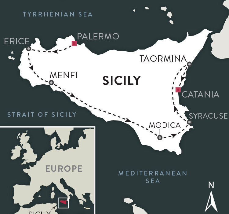 Our Italy hiking tour unfolds as we leave the bustle of Palermo and head to the countryside, where we spend our days exploring the historic hilltops and breathtaking coastlines of Erice, Monte Cofano, and Caltabellotta, before departing for the eastern half of the island. Our journey is accented with tastings from the surrounding vineyards, experiencing Sicilian gastronomy, and cultural excursions that take us into the heart of Sicilian history.