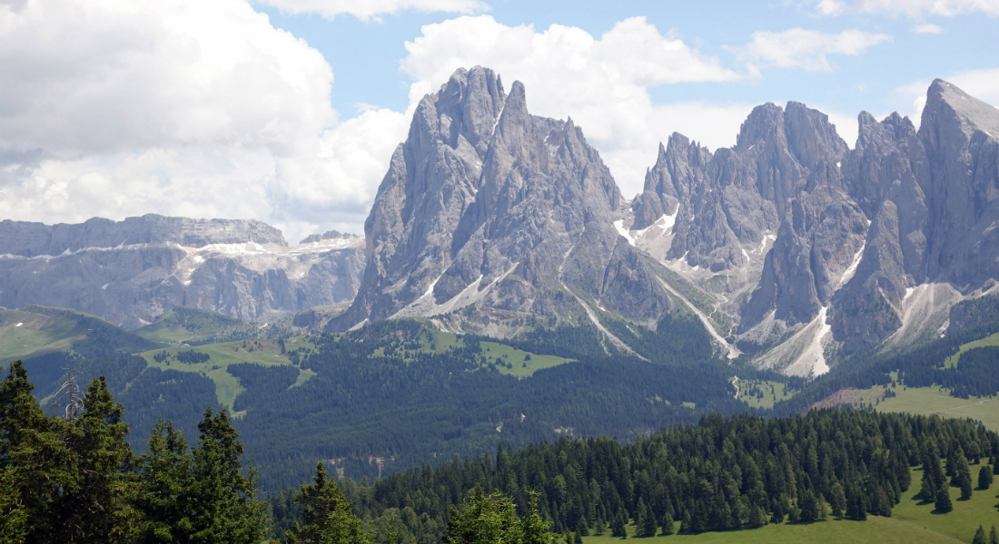 Ortisei is dominated by the Rasciesa Peak in Val Gardena. This valley is locally known for skiing and rock climbing as well as its woodcarving tradition, which has flourished here since the 17th century. The flank of the Odle mountain group, aptly named "needles" in Ladin, has been subject to long term erosion, revealing the fascinating earth and rock strata underlining the principal pale dolomite rock. We see an array of geological material including gray chalks dating back 240-250 million years, wine red porphyry from a relatively late volcanic phase, and a blood-red variety of sandstone.
