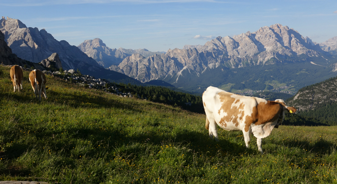 The hike begins at the Rifugio Malga Ra Stua (5,538'), a cozy hut-come-dairy farm set in a valley lying between the Croda Rossa and Lavinores Dolomite groups. The name "stua" comes from "dam" (the nearby stream used to be harnessed for energy to operate machinery for the medieval quarry of red stone next to the hut).
