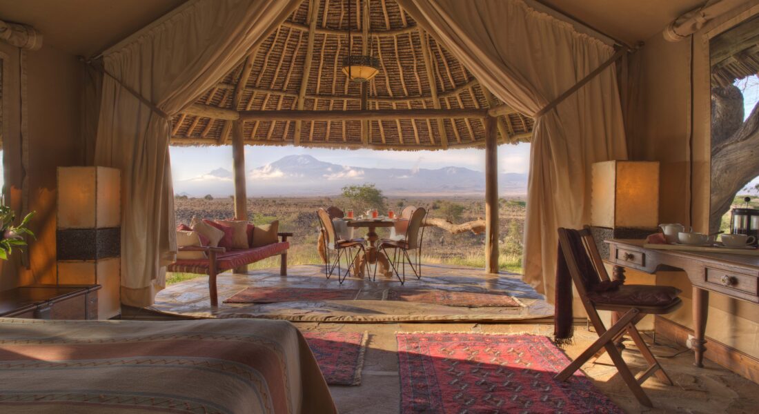 Tortilis Camp is set away from other Amboseli lodges, on the pristine southwest border, with the best mountain views and full access to both Amboseli and an exclusive private conservancy, where game walks, bush breakfasts and off-road driving are allowed. 16 spacious tents, each consisting of a main bedroom, elegant ensuite bathroom, private veranda, and glorious view of the mountain are complemented by a family tent and private villa. A lounge, bar and dining area, exquisitely built with natural materials and thatched roofs, provide a place to catch up after safari activities.