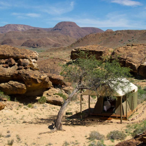 This camp is located in heart of the rocky desert of Damaraland, an ancient, starkly beautiful landscape. It comprises of 5 semi-permanent dome tents on wooded platforms, each with a small viewing deck. Inside, guests find comfortable mattresses, plush bedding, and an open-air, ensuite bathroom complete with flush toilet and hot and cold running water. Tucked away amongst the sandstone hills, Damaraland offers endless vistas and one of the best wilderness areas in Namibia.