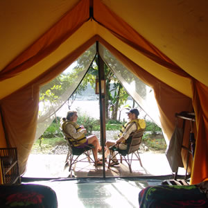 Set next to the river and accessed only by boat, Seti River Camp provides rustic and relaxing accommodations in Nepal’s verdant forests near Pokhara. This permanent tented camp features 16 roomy safari-style tents with beds, verandahs and ensuite baths, including hot showers and flush toilets. Around camp guests can relax in the hammocks, loungers and around a cozy fire pit that is lit nightly.
