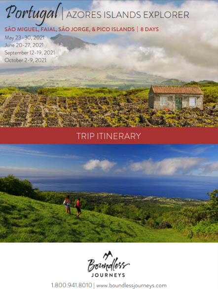 Boundless Journeys' trips are designed for energetic and flexible individuals who like to be active, have a spirit of adventure, and a positive attitude. The Azores Islands Explorer is rated a 3, moderate, on a scale of 1-5 (with 5 being the most strenuous). The fertile landscapes, rolling hills, and coastal paths offer a range of beautiful scenery and a mix of easy walks to strenuous hikes, with some rocky and steep sections.