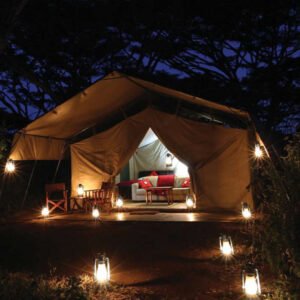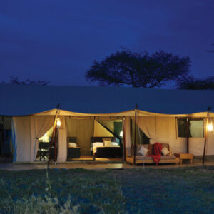 Our deluxe mobile tented camp allows us to experience the grandeur of the Serengeti in privacy, comfort, and style. The camp is situated to take best advantage of the seasonal movements of the great migration, and features innovative tents, with a unique open-ceiling shower to experience unforgettable African skies. LED lighting allows you to move freely about your tent at night without a flashlight, and a candlelit dining tent with silver service meals evokes the finest safari traditions.