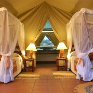An intimate camp set in a beautiful acacia forest on the rim of the Ngorongoro Crater, Lemala Ngorongoro Tented Camp has nine spacious canvas tents, each featuring two queen beds and roomy ensuite bathroom with dressing area, flush toilet and a large gravity-fed hot shower. Tents are heated, and beds are equipped with winter weight duvets and hot water bottles. The mess tent is beautifully furnished with comfortable sofas, lamps, antiques, and rugs.