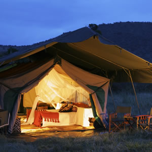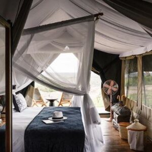 This well-appointed, traditional tented camp moves seasonally, so that we are always close to the Great Migration in privacy and style. Nine spacious tents with comfortable beds, side tables, and a writing desk are scattered across a private, remote landscape. Private bathrooms attached to each tent include shower, flush toilet, washbasin, and vanity. There is also a dining and lounge tent with waiter service and a fully stocked bar.