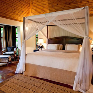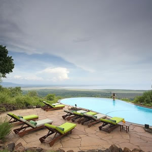 Undoubtedly the finest accommodation along the crater rim, Ngorongoro Crater Lodge is unique among African lodges. Each room has a central living area and viewing decks overlooking the spectacular Ngorongoro Crater. Colonial-style interiors combine regal colors under banana-leaf ceilings and grass roofs. Antiques, voluptuous raw silk curtains and tall, leather-backed chairs blend with African art to complete the ambiance. The lodge is divided into three camps of just 10 guest rooms each, arrayed around a central dining area and lounge.