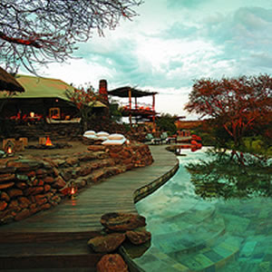 Hugging the jagged Ngorongoro Crater rim, each of the rooms of this deluxe safari lodge has its own private balcony, offering uninterrupted views of the volcanic amphitheatre far below. The stone lodge features a grand hearth, where a fire is kept continually burning to ward off the chill of evenings on the rim. Arched stone passages lit by torches, timbered decks, and walls decorated with stylized prehistoric cave paintings evoke the essence of African history.