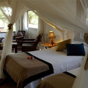 Newly built in 2014, Chinzombo brought a new level of style to the Luangwa Valley. The camp offers river views and private access to one of the most game-rich areas of Kafue National Park. Although luxurious, the camp retains an authentic bush feel, with grass and canvas walls surrounding spacious living areas. Six villas and a family suite each offer a private pool, cooled sleeping area, and massive bathroom. The camp also offers a yoga deck and spa.